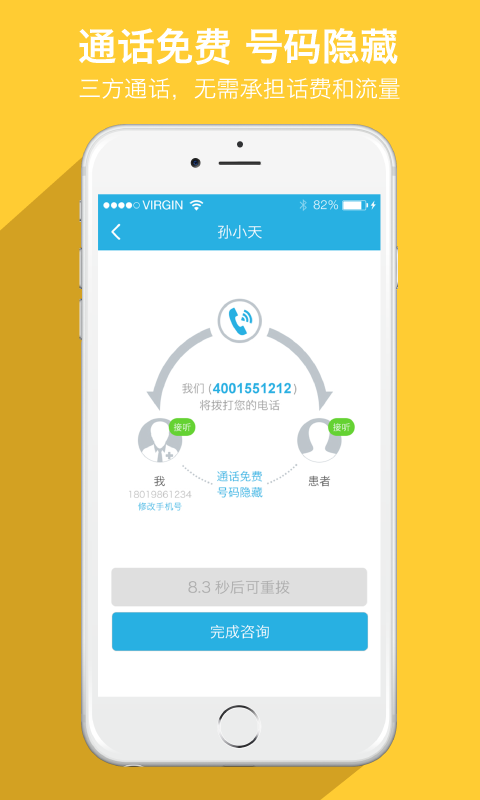 4、免费通话功能:平台提供了三方通话功能,医生需要进行电话问诊服务时,可以由平台提供的三方通话平台,分别拨通医生和患者的电话,使医生和患者可以进行问诊,最大程度的保障了医生的私密;