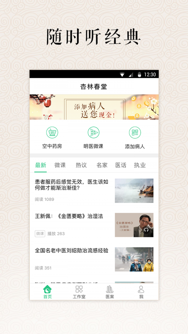 杏林春堂app是一款用于改善医馆诊疗服务的产品软件。杏林春堂app为患者提供复诊咨询、在线挂号、在线开方等能够有效改善医疗服务的功能。