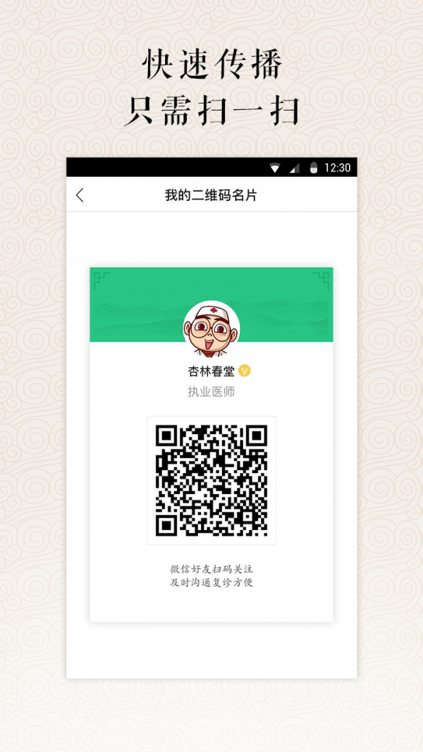 本app是杏林春堂国医馆(线下实体医疗机构)内部的一款用于改善医馆诊疗服务的产品,面向的群体主要是杏林春堂国医馆内部的医生职工。医生可以通过本app管理线下已就诊的患者,为患者提供复诊咨询、在线挂号、在线开方等能够有效改善医疗服务的功能。患者端使用的是「杏林春堂国医馆」微信服务号。