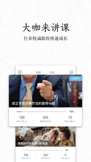 app是一款专为心理咨询师打造的客户端应用,手机版方便咨询师与客户一对一交流,发表自己的见闻,与界内人士一起讨论与分享,还有精品独家课程。