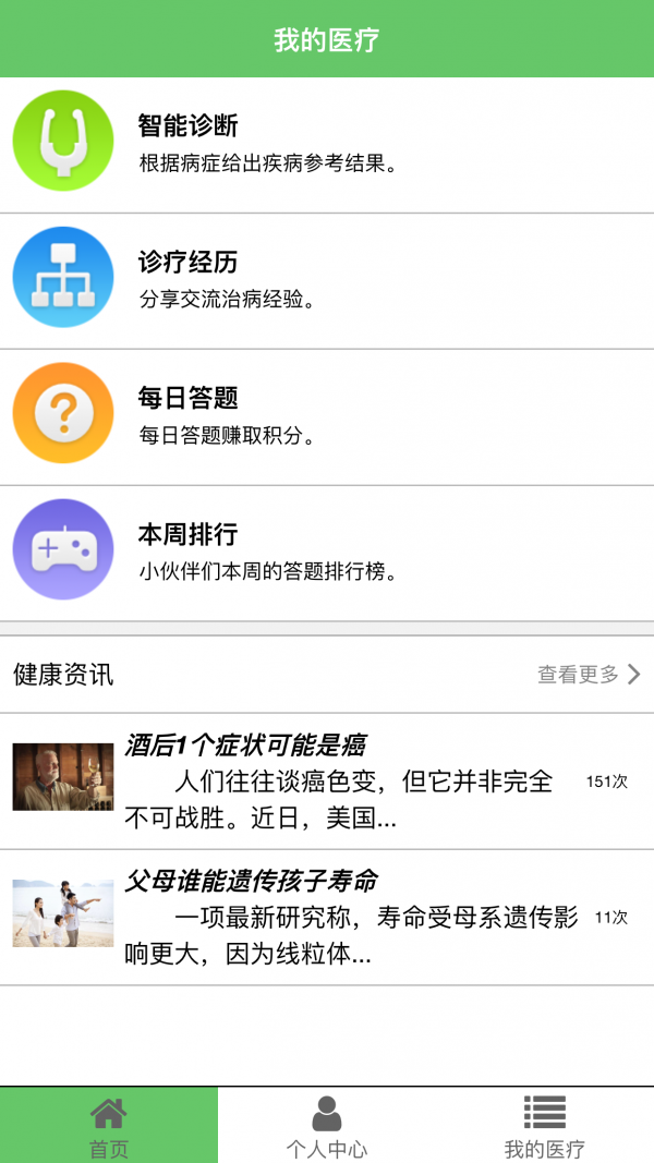 1、我的医疗安卓版包括智能诊断,诊疗经历,每日答题,个人中心,我的医疗等功能模块。
