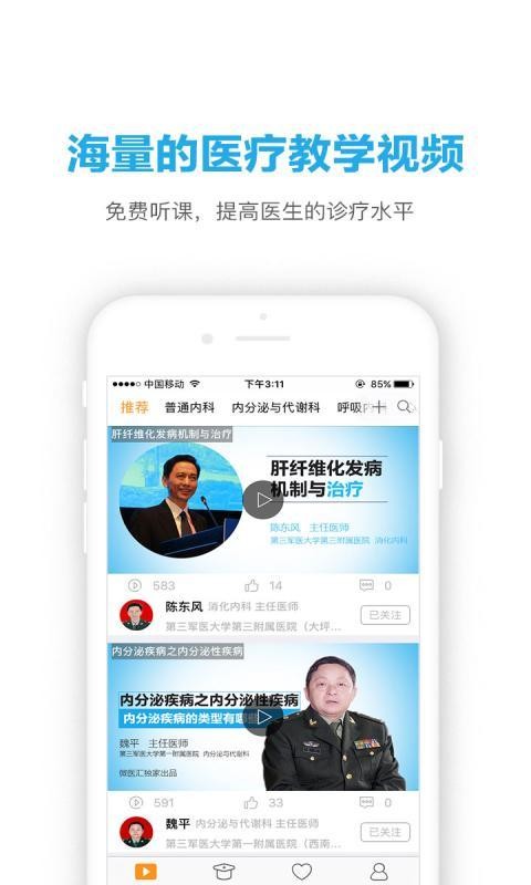 2. 视频短、快、精、随时随地随意性,医生可利用碎片时间学习技术,提升技能。
