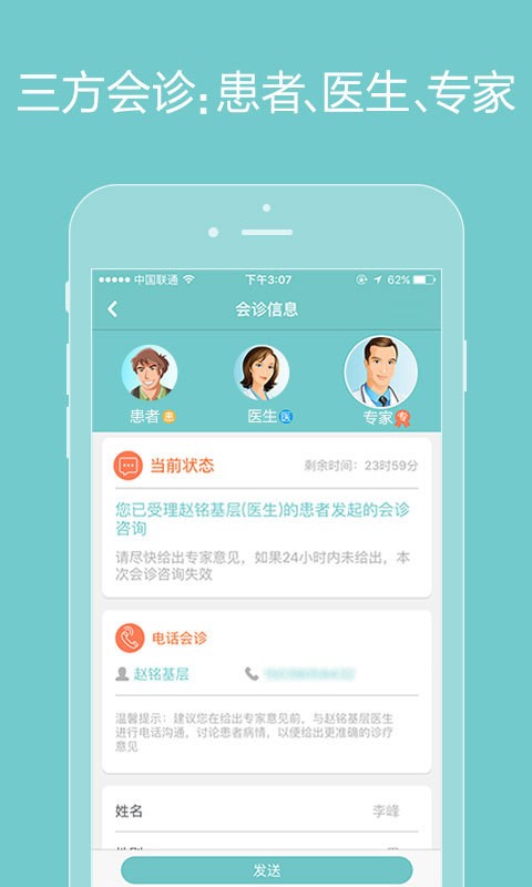 4.线上私人诊所,医生自由设置会诊、转诊、电话咨询、病例咨询,开展三方会诊和转诊