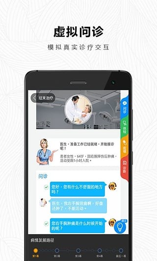 依托丰富的病例资源,用户可登陆治趣进行虚拟问诊、体检、医嘱、诊断等一系列临床诊疗交互,获得详细病例解析,全程模拟真实医患就医场景,感受病人抢救的紧张过程,帮助用户合理判别病情、正确诊疗病患、循证最佳医疗方法,这不仅减小了临床风险,还大大降低了学习成本。