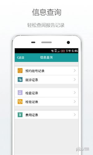 【信息查询】患者可以通过客户端轻松查阅检验检查报告单,免去了往返医院带来的不必要的麻烦,并且客户端还提供患者查询预约记录、就诊记录和费用记录。