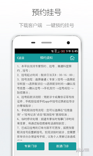 【预约挂号】提供本院全部科室普通门诊和专家门诊的预约挂号功能,患者只需一部手机,即可完成预约挂号。