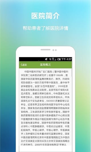 “广安门医院”是中国中医科学院广安门医院官方推出的手机应用软件。旨在医院现有服务基础上简化预约流程,减少就医等候时间,方便患者就医,改善患者就医体验。客户端主要功能:【手机预约】提供本院所有科室专家门诊和普通门诊的预约,患者只需一部手机, 即可完成预约。【报告查询】患者可以通过客户端轻松查阅检验检查报告单,免去了往返医院带来的不必要的麻烦。【科室医生】提供本院所有科室医生的简介,以及医生出诊的时间,方便患者选择适合自己病情的医生。【就医指南】提供医院门诊指南,方便患者了解医院门诊挂号时间、付费时间等,并向患者提供办理住院相关手续流程。【导医服务】方便患者查看医院地址和联系电话,并提供医院内外导航,给患者,尤其是外地患者前来医院就诊提供方便。声明:“广安门医院”由 中国中医科学院广安门医院 与 苏州智康信息科技有限公司 联合研发。