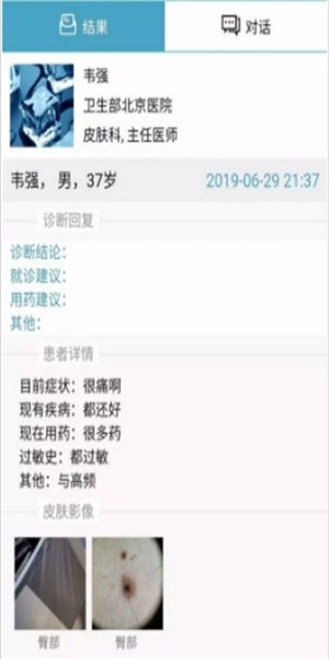 2.皮肤科医生远程会诊、交流。两个皮肤科医生相互加好友后,就可以把自己的患者大体图、皮肤镜图影像病例及病史等信息推送给医生好友,请医生好友帮助诊断。很快,医生好友可以直接在“”进行类似于微信的交流,建立皮肤科团队群、专业群。