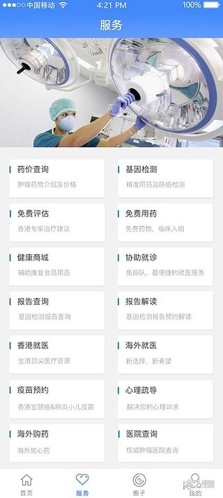 【服务】全球同步的服务资源,集合了医院查询、药价查询、基因检测、免费用药、免费评估、专业客服等功能,抗癌路上你需要的我们都有。