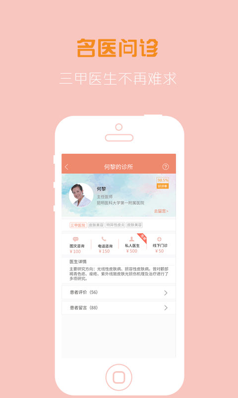 2.找医生:按病种、医生的价格或好评率等多功能搜索,精准便捷选择所需医生;通过文字、语音、图片、电话等多种途径向医生咨询