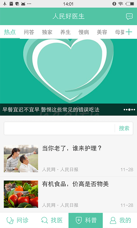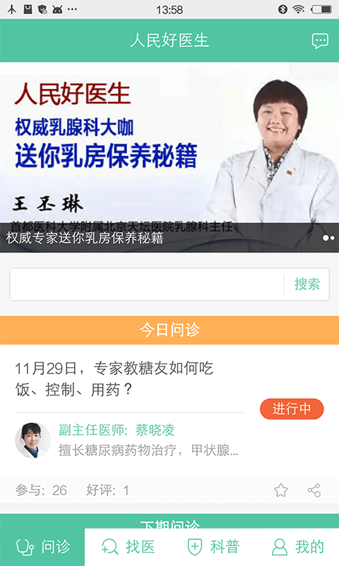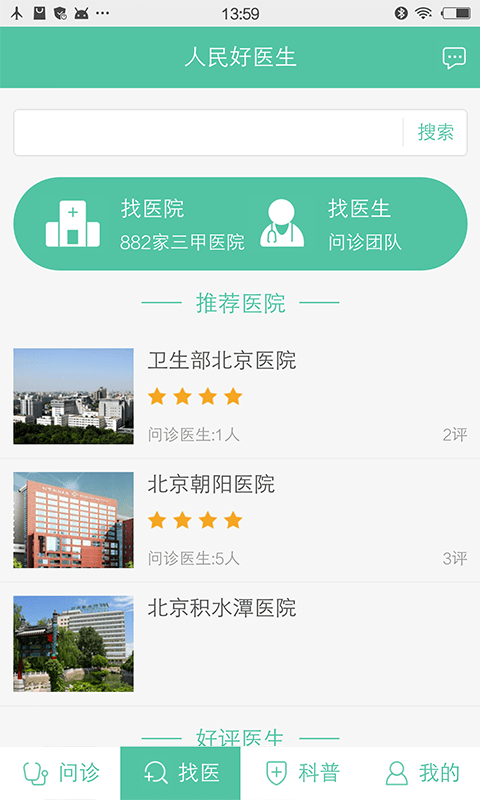 找医生:人民好医生问诊团队,成员为全国三甲医院副主任医师以上的知名医生。可对医生进行留言咨询,定期回复。