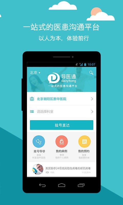 导医通产品的用户定位是服务于广大有就医需求的患者、医院及医生群体,运用移动互联网技术为患者建立起一个智能化的就医平台,将患者在就诊前、就诊中、就诊后的医疗服务完整的连接起来,把预约挂号的窗口从医院的挂号室搬到手机端,缩短患者在医院的停留及等候时间,并逐步建立后续