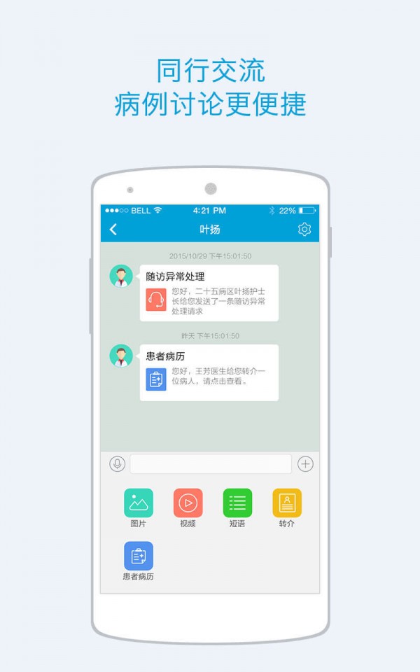 -----消息互动:以文字、图片、视频、短语、患者转介、患者病历、随访异常处理提醒等多种方式,便捷的实现与患者之间的消息互动、与同行之间的病例讨论,从而实现院后患者服务的连贯性和可信性。