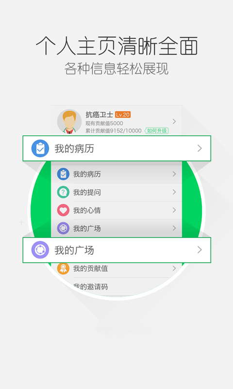 在这里,可以找到患同样病症的病友,互相交流抗癌的经验;在这里,可以记录您抗癌的心路历程,进行情感沟通与抒发;在这里,可以分享您的治疗康复经验,为更多病友提供帮助;在这里,可以学习防癌抗癌相关知识,守护您及家人的健康;在这里,可以组织健康、积极的活动,聚集病友互帮和互助;希望能做到的更多,希望病友能得到的帮助更多!从情感交流出发帮助病友及家属建立信心从信息交流出发协助病友及家属互帮互助,从内容交流出发辅助病友及家属完善治疗抗癌帮手防癌卫士通过“”聚集所有病友及家属的力量,为癌症患者建立一个互爱、互助的精神家园!向癌症开战-做情感干预癌症患者生命质量和生存时间的第一移动平台。