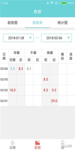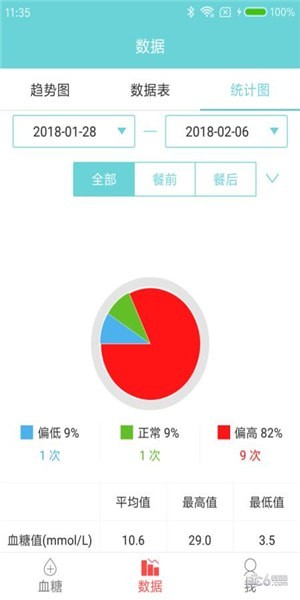查看统计图能更为详细,在一个时间段内血糖偏高次数,偏低次数和正常次数都能看见