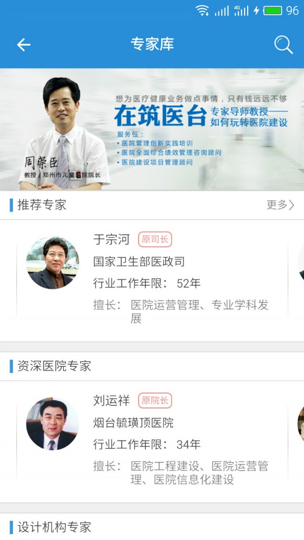 目前平台有300多位国内外医院建设顶级专家,还会持续推进。希望能够在2016年的底建成覆盖所有细分专业、全球主流区域及地区,三到五千人的专家库,提供包括五个领域,医院建筑、装备、用人管理、信息化、学科发展等为核心的专业服务。