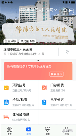 是由四川万达健康数据有限公司官方推出的一款服务绵阳市民的惠民应用,提供预约挂号,门诊缴费、住院金预缴、检查报告查看等惠民功能