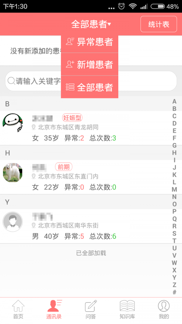 [在线随访]按血糖异常,新增患者,全部患者来管理患者,可查看单个患者详情,进行与患者点对点沟通