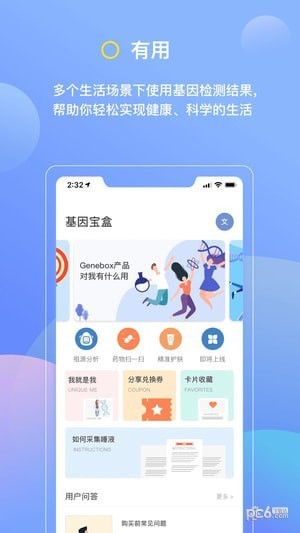 是一款有用、准确、快捷的基因检测工具,基因宝从用户的基因信息出发,向用户提供个性化的、科学健康的生活解决方案,用户可以将基因宝应用在护肤、减肥、运动和饮食等生活的方方面面,高效地改善生活质量。欢迎广大用户下载体验。