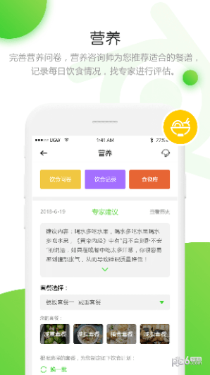 完善营养问卷,营养咨询师根据偏好以及身体基本指标推荐适合的餐谱,可以在APP内记录每日饮食情况,可以每日饮食分析,找专家进行评估。
