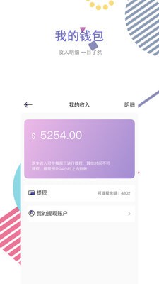 【钱包】医护人员可以查看自己的钱包状态,可以点击金额去提现;也可以查看原来每单收入情况。