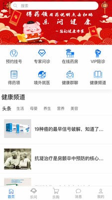 主要实现功能:预约挂号、专家问诊、VIP陪诊、得药领、境外就医、健康群聊、健康频道、乐购、学术直播、乐问拜访、学术活动、专家讲堂、学术交流等。