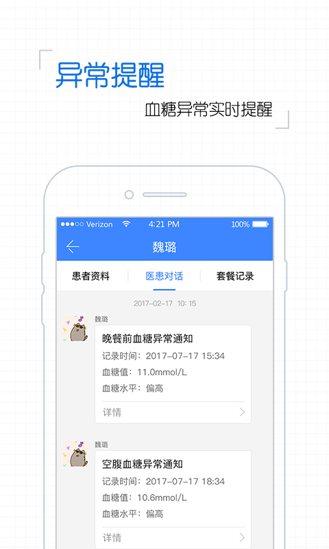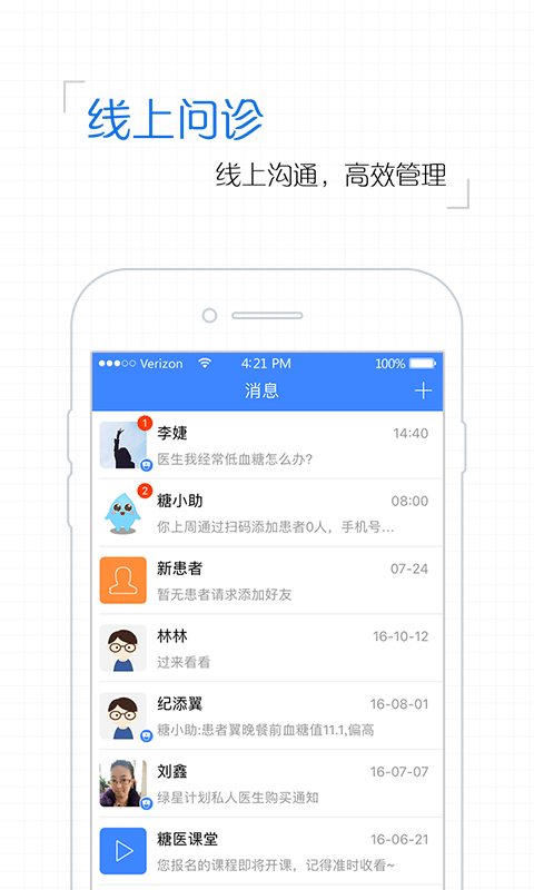 为糖友和医生之间建立了一个即时、有效、便捷的沟通渠道,协助医生更好的管理糖友。