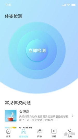 app通过人工智能在线检测体姿,发现异常体姿,提示潜在风险,提供矫正课程。体姿健康贯穿人的一生,全面营养和正确运动是拥有良好体姿的重要手段,app提供了从孕期到成年的各类营养和运动课程,包括幼儿体质、小学生体测、中考体育、体能课程,以及互助问答和专家咨询。