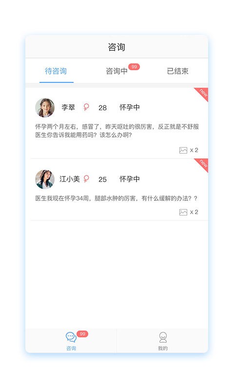 问诊记录管理:医生可以对待咨询、咨询中、已结束的问诊记录进行管理。