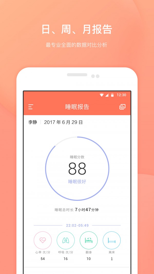 统计心率、呼吸、体动和离床数据,深睡、浅睡和清醒的时间,合理安排睡眠,提升健康水平。
