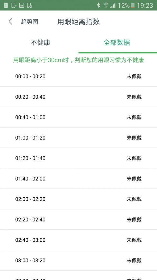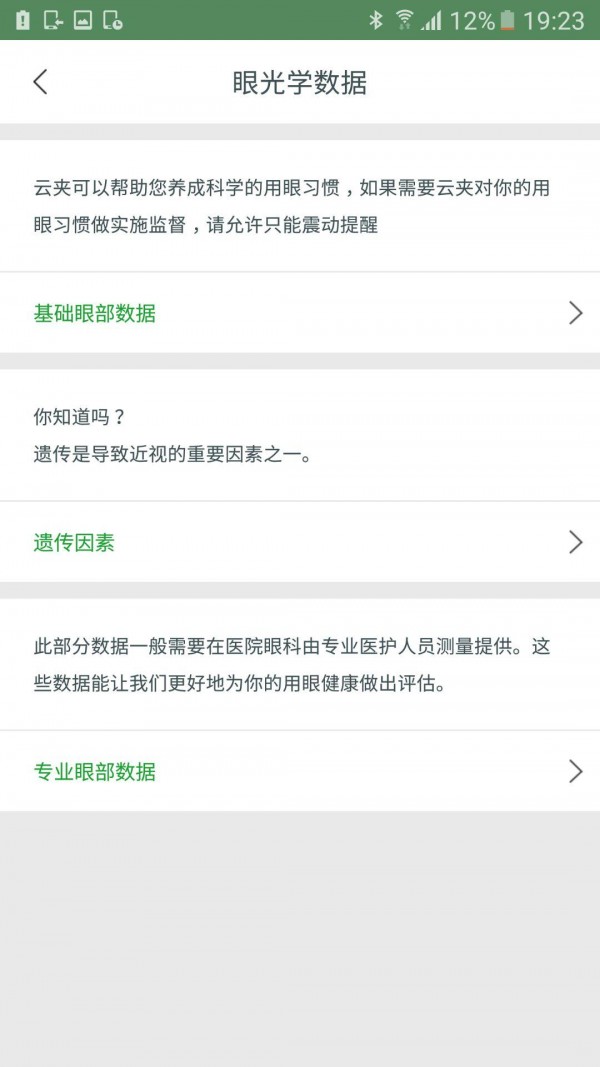 首次登陆,由于用户尚未佩戴设备,云夹APP会暂时显示无数据。在使用设备1小时后再次进入APP,将会呈现用眼数据报告。