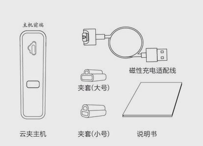 内容物包括:近视控制夹扣主机(专业版)、夹套(大号、小号适配不同尺寸镜腿)、充电线、说明书