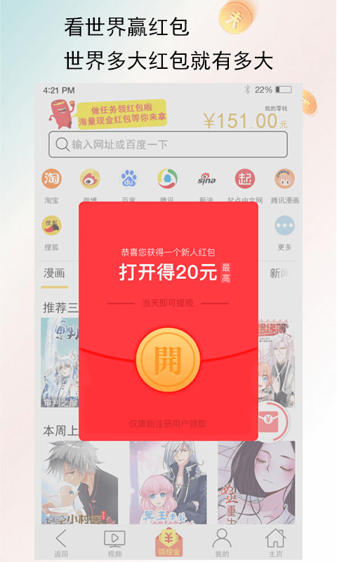 app是一款使用浏览器还能赚现金的客户端应用,手机版下载注册就能领取第一笔现金,并且还能免费看漫画、看小说、追剧等等,随时使用赚钱。