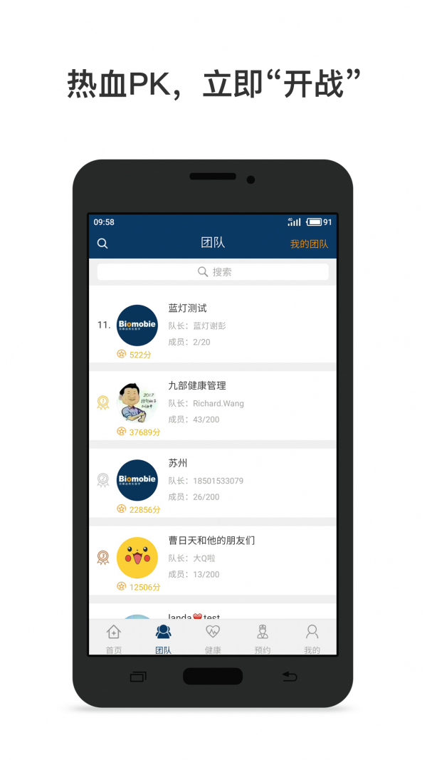 3、“团队”模式:用户可与自己的亲友在应用内组建属于自己的团队,并与其它团队进行PK,获胜后将获得一定奖励。