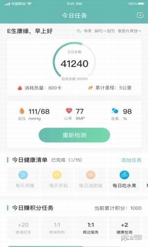 通过查看每日健康步数,轻松了解掌握健康数据。每日定制专属的健康清单,用改善生活行为来提高用户的健康习惯。同时通过多种健康任务可获取不等值积分,可在线免费兑换超千款海量商品,给予用户健康奖励。