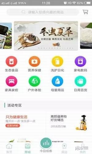 以生态家庭为核心的专业健康线上商城,商城的品类有健康食品、家庭保健、洗护丽人、家电数码、家居家纺、运动户外、母婴用品、日用百货。并可通过签到、分享、发帖、健康任务等多种方式赚取积分,免费兑换各类产品。