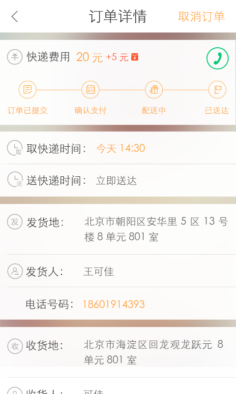 2、快速响应:您下单后系统自动将任务发送到离您最近的快递员手机上,即刻上门为您服务。快递员取件后,送达到您指定的目的地,无任何中转环节,真正即取即送、专人直送、全程监控,让您感受到更好的服务体验。 3、支持同城快送:目前开通北京地区。