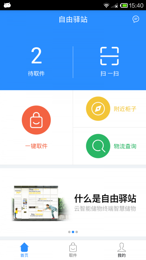 为用户使用自由驿站智能储物柜开发的App。主要功能有取件、快件查看、物流查询以及对智能储物柜的定位。