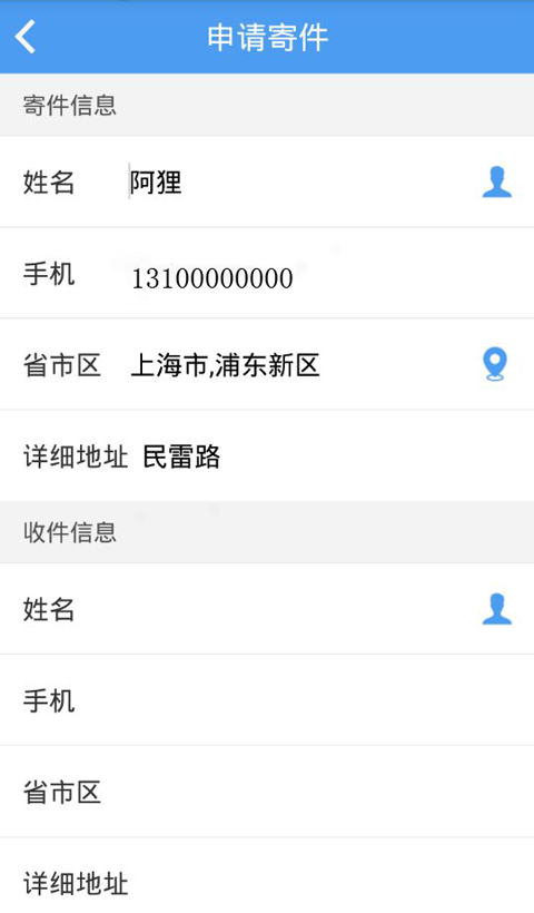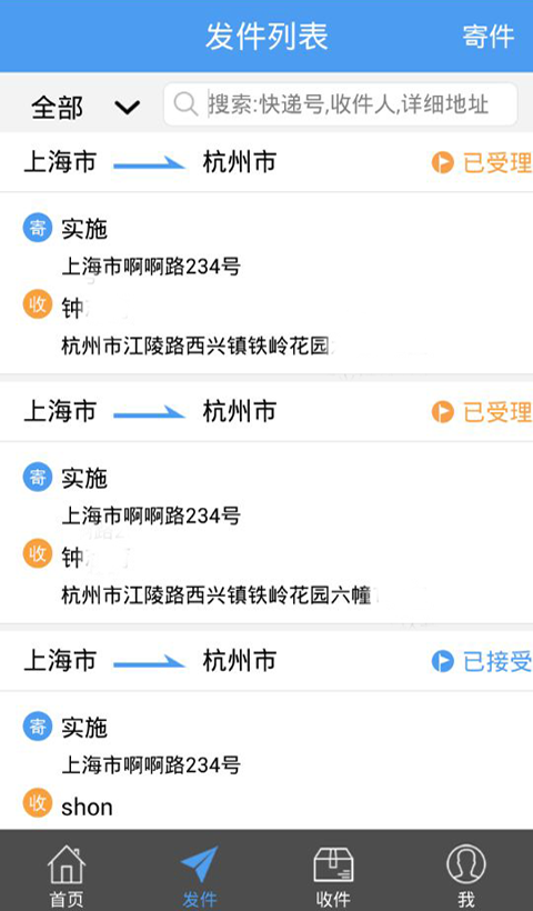 * 寄件:自动保存寄件人和收件人信息(姓名、手机号、地址),常用地址寄件、一键发件。