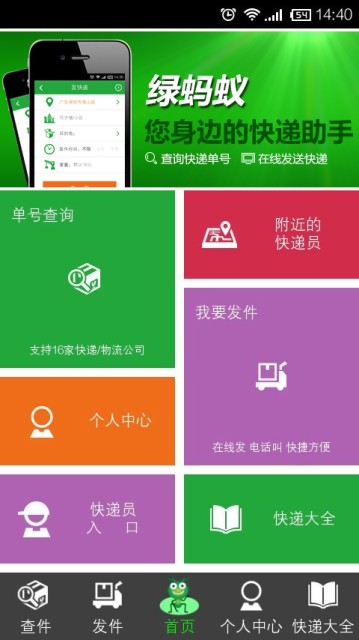 “绿蚂蚁快递”是一款生活常用的移动应用,主要功能包括:一键查询所有快递公司快递单号、在线发快递、查找附近的快递员、快递网点大全,是用户必备的一款手机应用。
