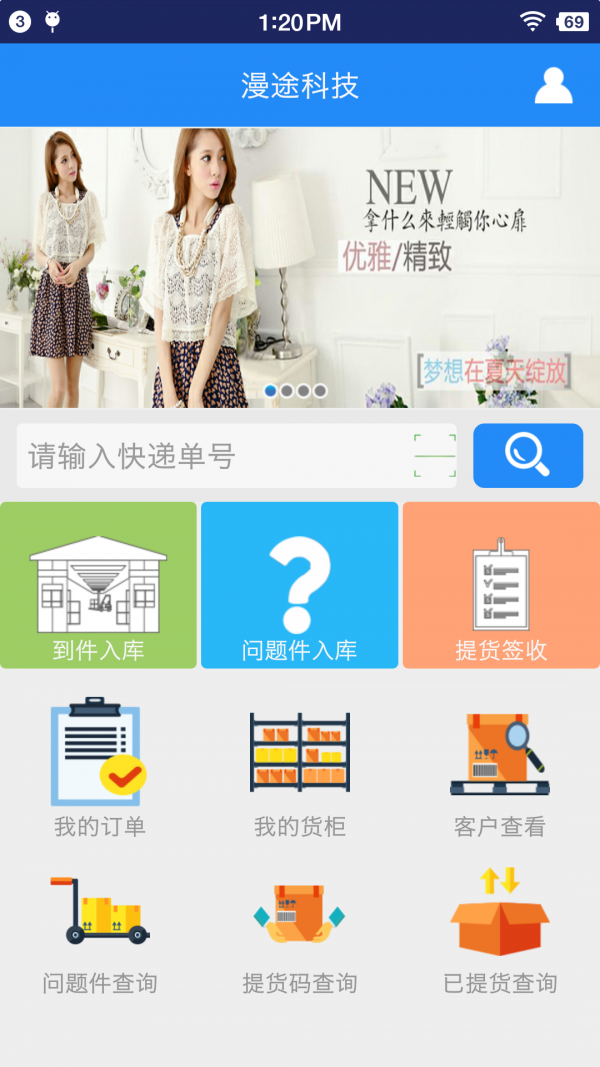 本应用用于社区快递自提管理,其中包含单号查询、到件入库、问题件入库、提货签收、我的订单、我的货柜、客户查看、问题件查询、提货码查询、已提货查询。