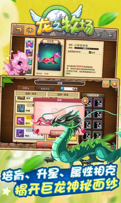 在《龙之牧场》里,你将扮演一个特别的牧场经营者。这个牧场养育的是传说中的巨龙!无论是可爱的海星龙,神奇的云龙,帅气的暴雪龙,还是具有现代感的机械龙,都能成为你牧场里专属于你的宠物!