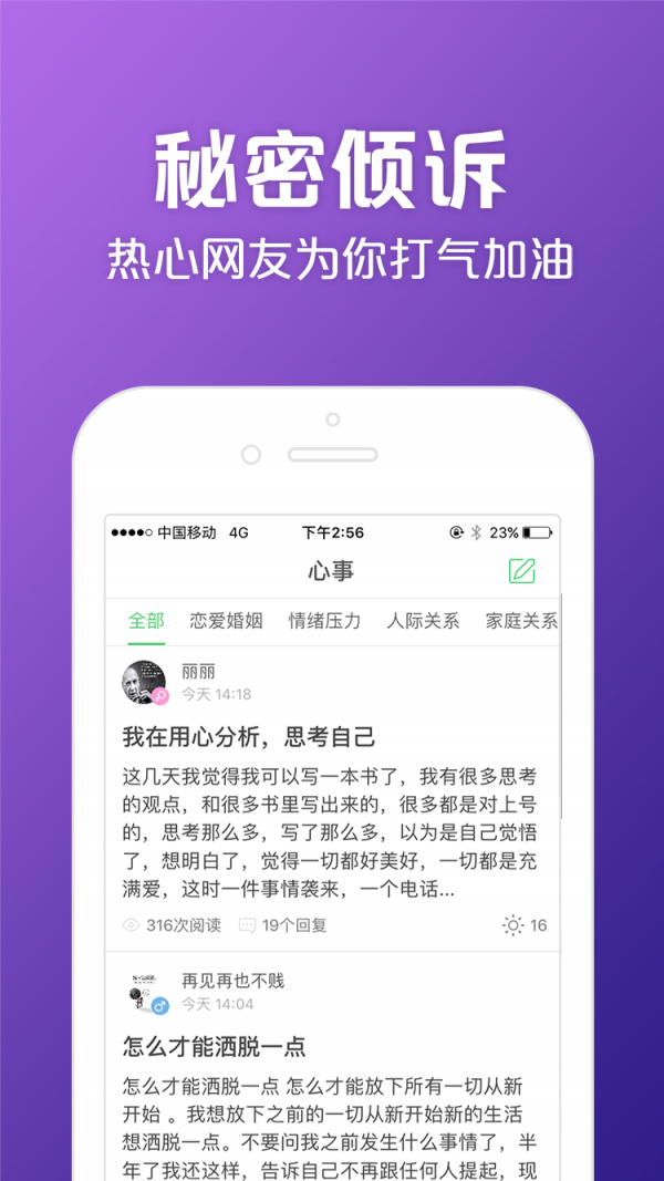 秘密倾诉app这是一个网络心理树洞,可以使用网络昵称匿名发泄心中的秘密,无论是恋爱秘密,情感秘密,职场秘密,还是家庭秘密,都可以宣泄。失恋、劈腿、感情不顺、抑郁焦虑、学业问题、人际交往问题统统可以这里大声说出来。