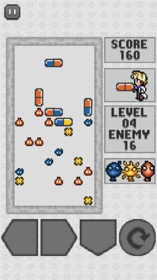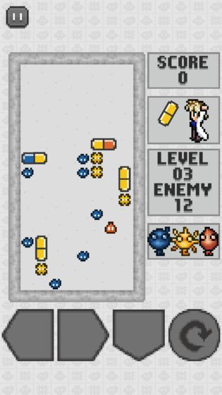 3、玩家可以操作掉下来的胶囊,并将其与一排颜色相同的病毒排列在一起,