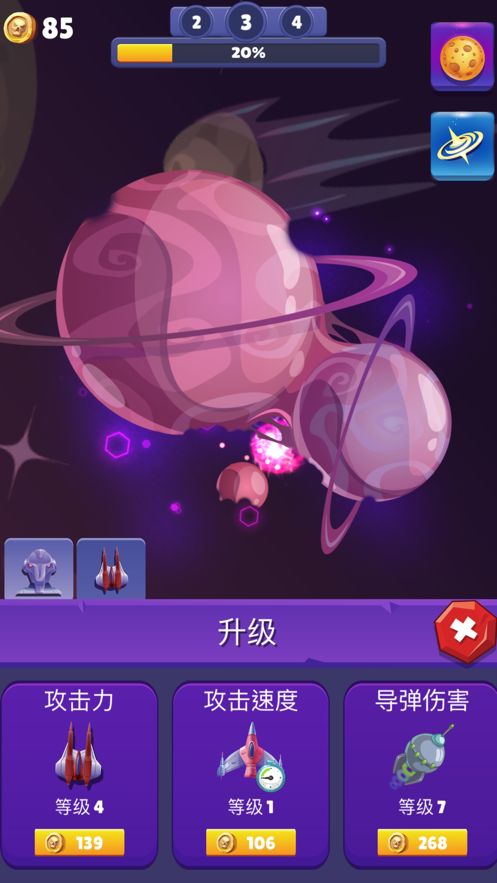 2、击破行星获取积分来强化自身,获得更强大的武器。