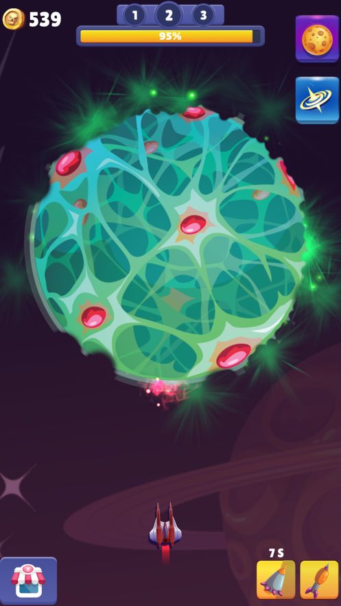 1、向着巨大的行星发动攻击,集中射击同时避开飞溅的危险。
