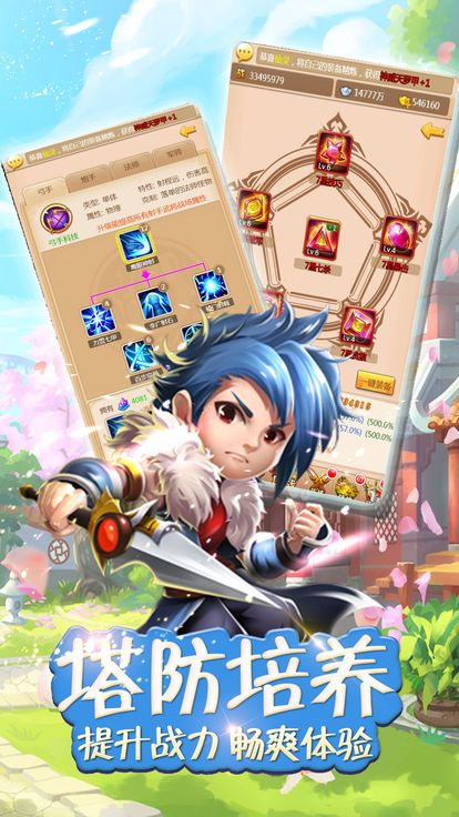 2、每个塔防和英雄都有不同的训练路线,可以升级,武器配备等,玩法多样,趣味无穷。