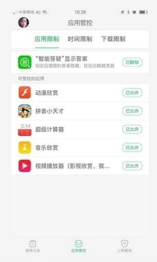 2.应用管控:可管控孩子下载应用、已安装应用是否允许使用、娱乐应用时长时间。