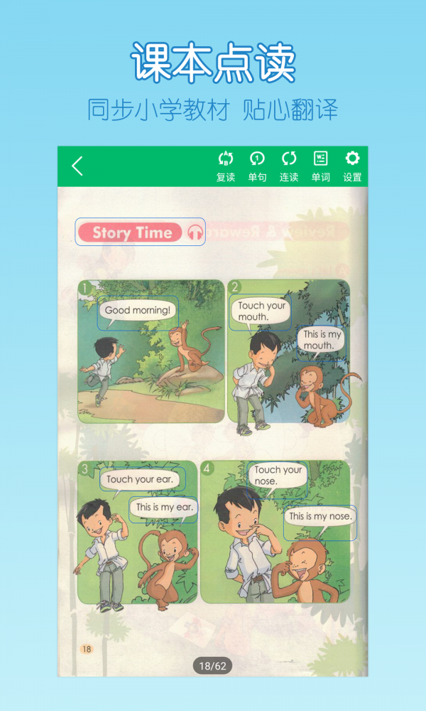 1、课本点读:同步教材、纯正发音、贴心翻译,可点读、连读、复读。