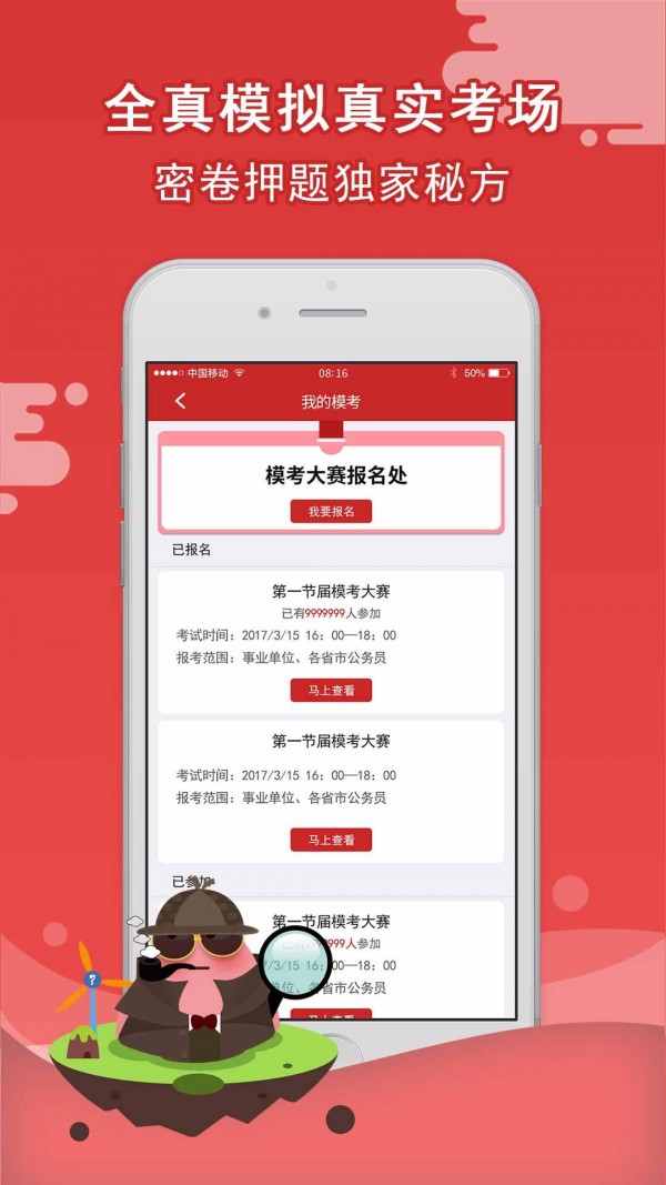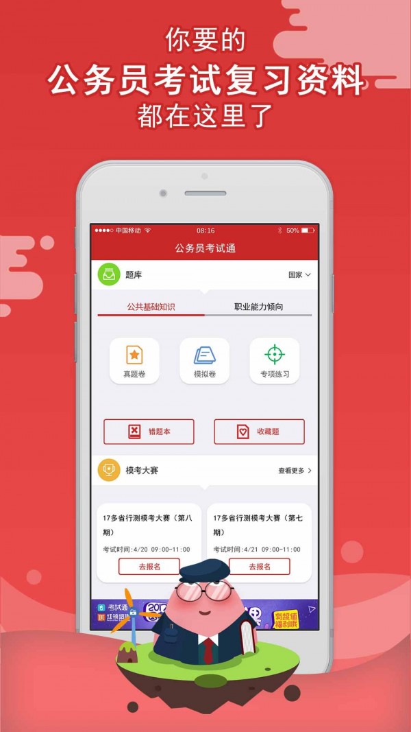 无论是国考、省考、市考还是事业单位考试,无论您是上班族白领还是学生,无论是在办公室、学校、食堂、地铁、出行旅游还是晚上在被窝中,只要您拥有手机,就可以随时随地备考,考场一试就见分晓!
